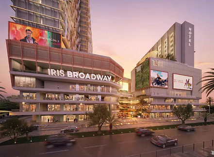 Iris Broadway Greno West is a one-million-sq.ft. green building with energy-saving features. It has a 25,000 sq.ft. central atrium with natural plantations and shading structures. The lifts give you panoramic views of the atrium and the mall houses a roof terrace with a garden, too.